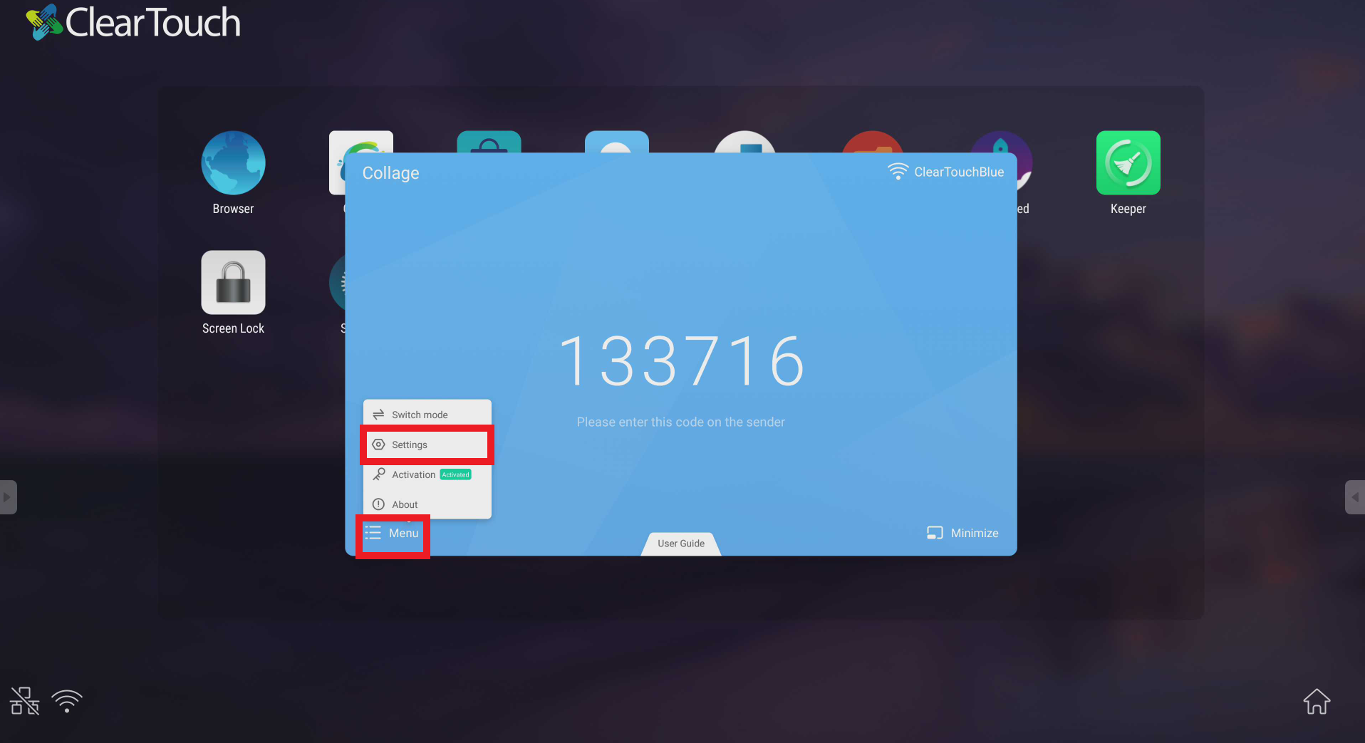 If you are experiencing issues connecting your external device to a Clear Touch panel using the Collage application or are receiving an error message such as "Incorrect code or not in the same network." We have a solution for you, you can simply enable Advanced Code Mode which will allow mirroring across multiple VLAN's in the enterprise network environment. To enable Advanced Code Mode you will need to first open the Collage application. If this does not correct the issue, please review our Clear Touch Networking Guide and open the ports listed below Collage.